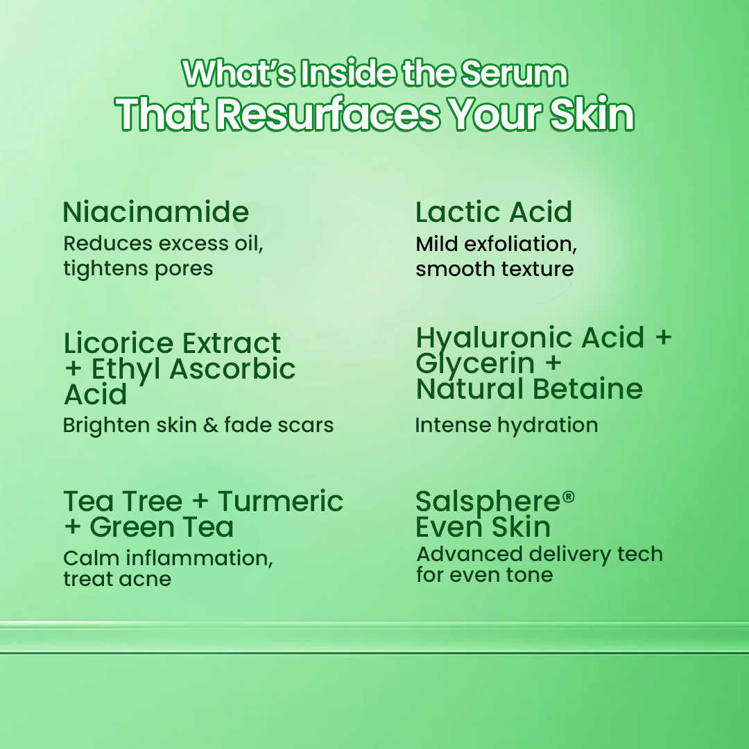 The Resurface Serum is a targeted treatment designed to reduce acne breakouts, minimize inflammation, and promote a clearer, healthier complexion. Formulated with powerful ingredients like SalSphere® Salicylic Acid, Tea Tree Extract, Turmeric Extract, Licorice Extract, Hyaluronic Acid, Green Tea Extract, Glycerine, and Ethyl Ascorbic Acid, it soothes, brightens, and rejuvenates your skin.