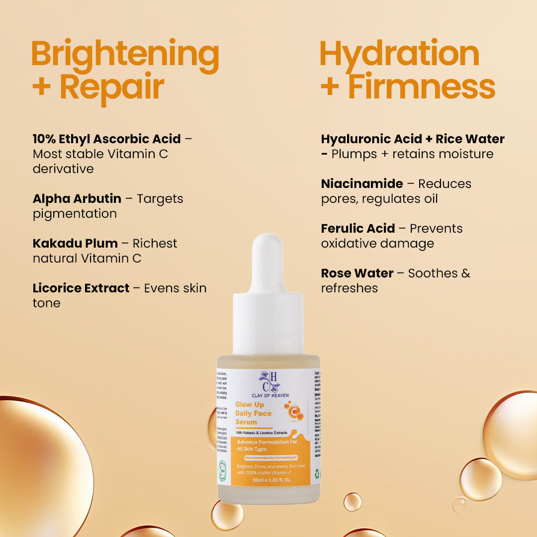 At Clay of Heaven, we’ve harnessed the power of nature and science to create a serum that does exactly that. The Glow Up Serum is designed to go beyond the surface and work deep within your skin to restore, protect, and rejuvenate. With nature’s most potent ingredients and advanced scientific formulations, this serum helps your skin rediscover its true potential, leaving you with a glow that lasts.